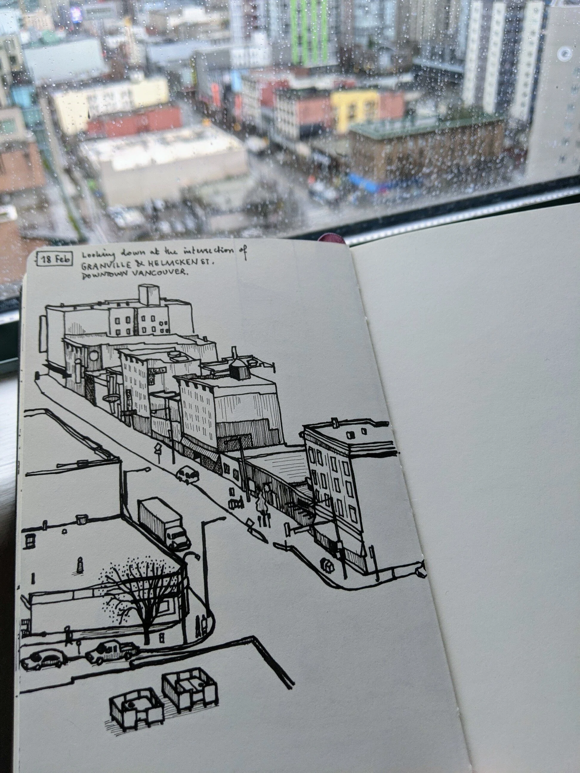 This was a view out of my window, facing the SSE direction. It was the street intersection of Davie and Granville in downtown Vancouver. It’s a busy area with lots of foot-traffic, buses and cars. But that wasn’t the real challenge. The real challenge was in the buildings, unmoving, unadorned. The real challenge was the shift of perspective from left to right.