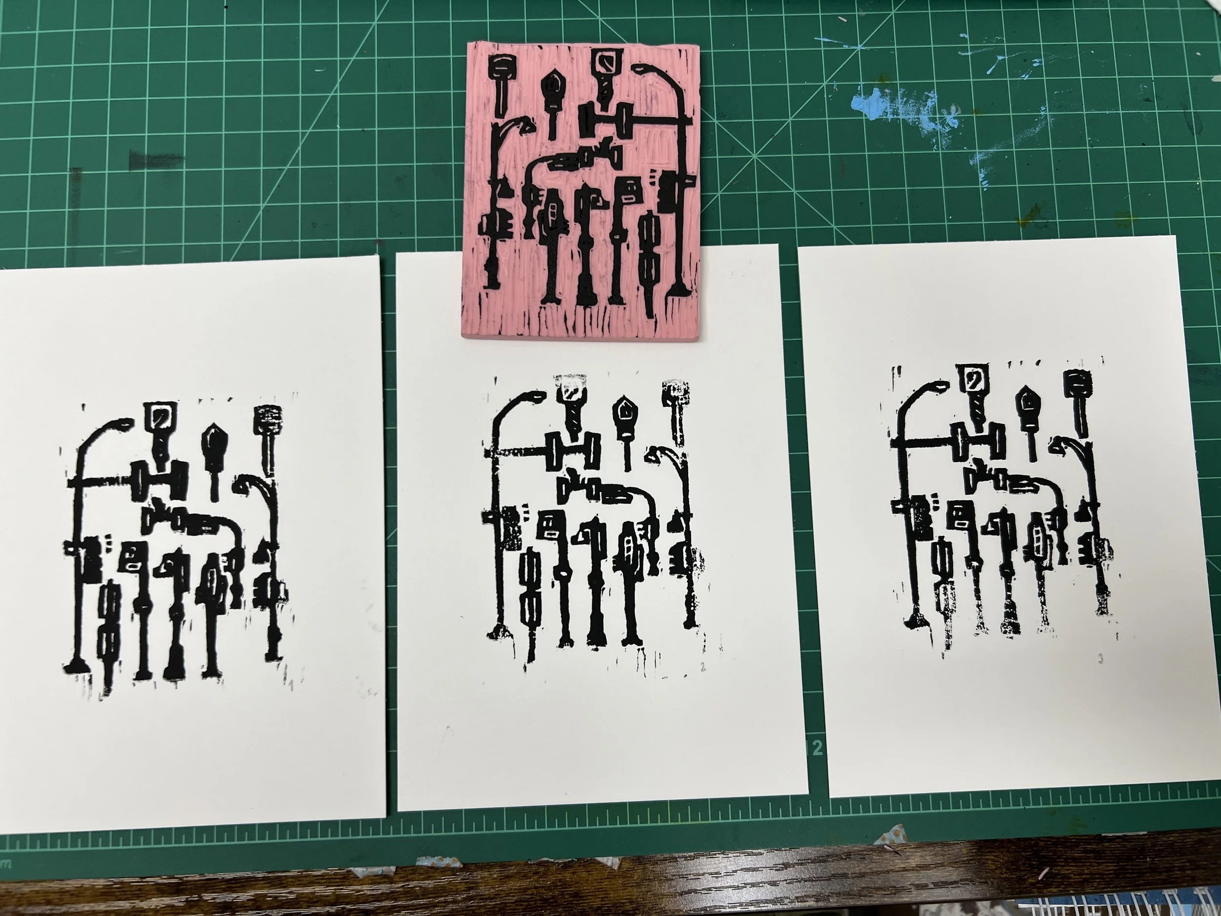 From a drawing on a translucent sheet, transferring to the block, making my first cuts, and spending double the time on all the negative space, it took me 2 hours to do a pretty bad job of my first linocut. The original drawing took less than a minute.